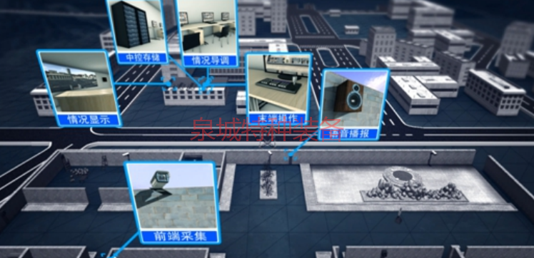 外圍封閉、實景模擬、導調(diào)模擬三個區(qū)、前端采集、情況顯示、末端操作、語音播報、中控存儲、情況導調(diào)六個平臺、供電、照明等設施。